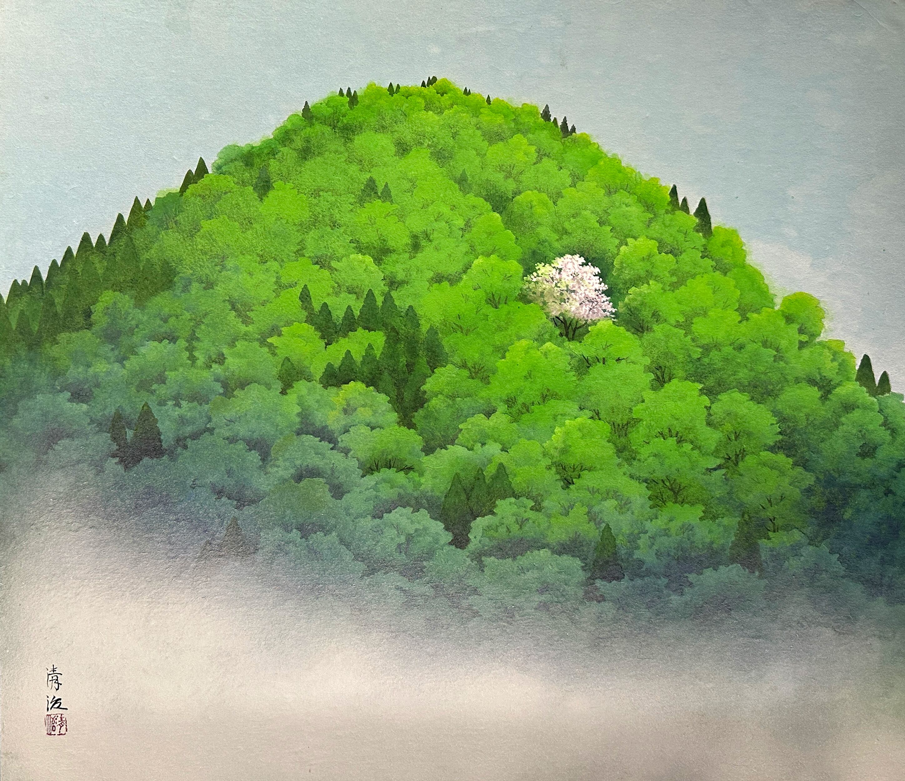 この「 緑山独楼(りょくざんどくろう) 」は、山全体を包むような新緑の深みと、その中にひっそりと佇む一本の桜の姿を描いた作品です。